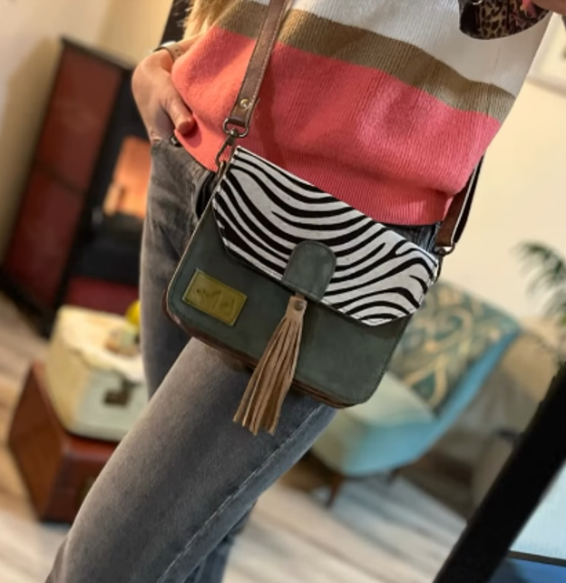 Esta cartera está hecha con cuero gamuza rescatado y tiene un diseño animal print que no pasa desapercibido, dando personalidad a cualquier look sin necesidad de exagerar. Tiene el tamaño justo: ni muy grande ni muy chica, perfecta para llevar lo esencial (y un poquito más). Por dentro, viene con tres compartimentos forrados para ayudarte a organizar todo y uno de ellos trae un bolsillo con cierre, súper práctico para que no estés buscando las monedas al fondo. El cierre es con broche magnético, para abrir y cerrar fácilmente. Y como nos encanta que las cosas se adapten a nuestro día a día, viene con una correa ajustable que puedes usar cruzada o al hombro, según te quede más cómodo.