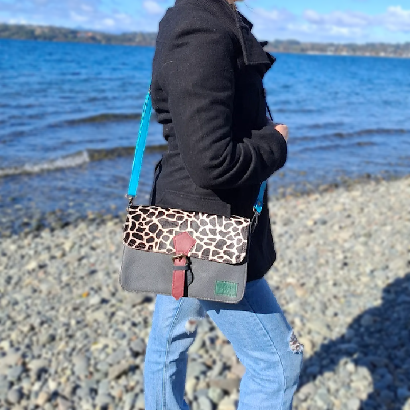 Cartera de cuero natural 100% rescatado con diseño Animal Print. Una pieza única que realza cualquier look gracias a su estilo audaz y versátil. De tamaño ideal para llevar todo lo que necesitas, incluye tres bolsillos interiores forrados (sin cierre), uno de ellos con un práctico monedero incorporado. El cierre es con hebilla magnética, segura y fácil de usar. Además, viene con una correa ajustable para llevar al hombro o cruzada, adaptándose a tu comodidad y estilo.
